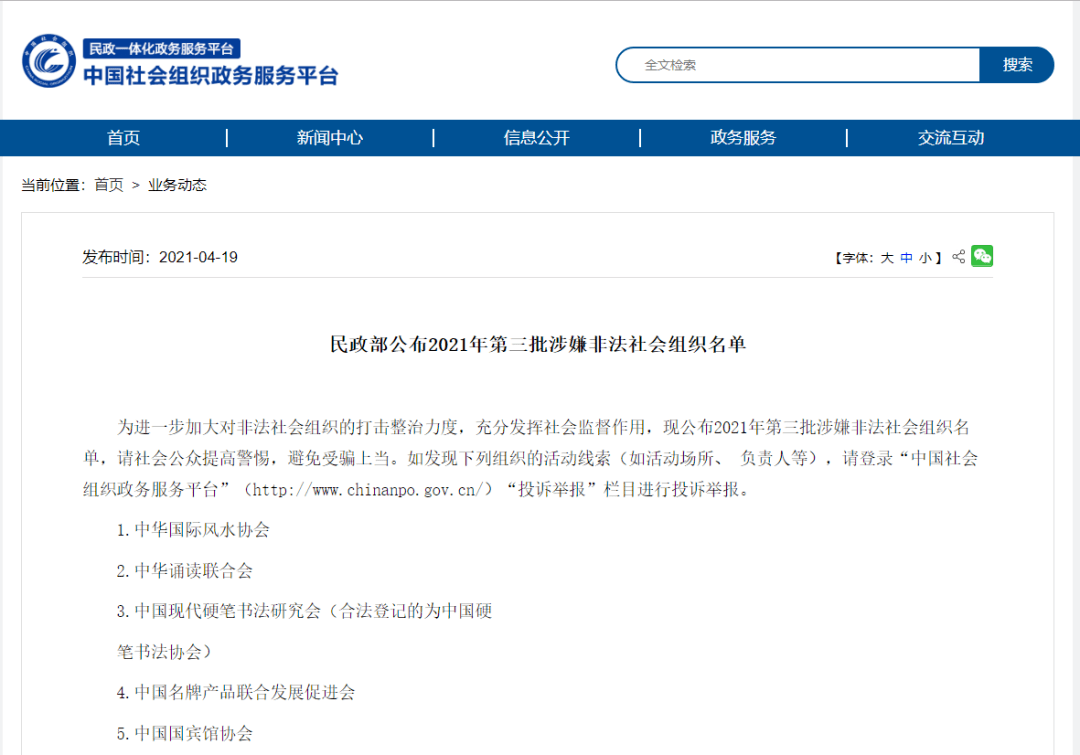 為進(jìn)一步加大對非法社會組織的打擊整治力度,充分發(fā)揮社會監(jiān)督作用,現(xiàn)公布2021年第三批涉嫌非法社會組織名單,請社會公眾提高警惕,避免受騙上當(dāng)。如發(fā)現(xiàn)下列組織的活動線索(如活動場所、 負(fù)責(zé)人等),請登錄“中國社會組織政務(wù)服務(wù)平臺”(http://www.chinanpo.gov.cn/)“投訴舉報(bào)”欄目進(jìn)行投訴舉報(bào)。2021年第三批涉嫌非法社會組織名單: