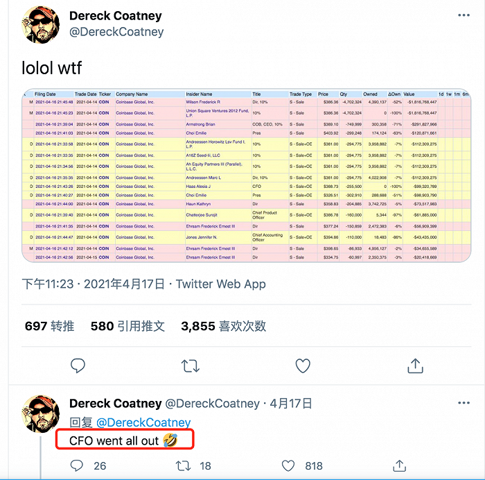 Coinbase上市不久套現(xiàn),圖源:Twitter/@DereckCoatney