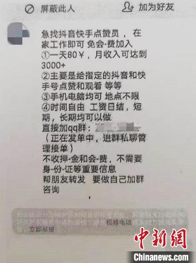 2018年3月,陳某在同學群看到一則網(wǎng)絡刷單兼職招聘廣告,只要在抖音、快手等視頻軟件上點贊、評論等,就能日賺幾百元,并且時間自由、及時返傭。