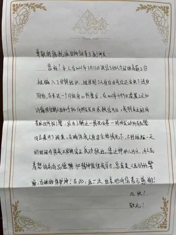 “是你們的雷霆出擊,讓我脫離險境,重獲自由新生!”譚小姐在感謝信中寫道,她表示錦旗與感謝信也無法表達(dá)自己的感激之情,“以后會更加好好生活?!?/p>