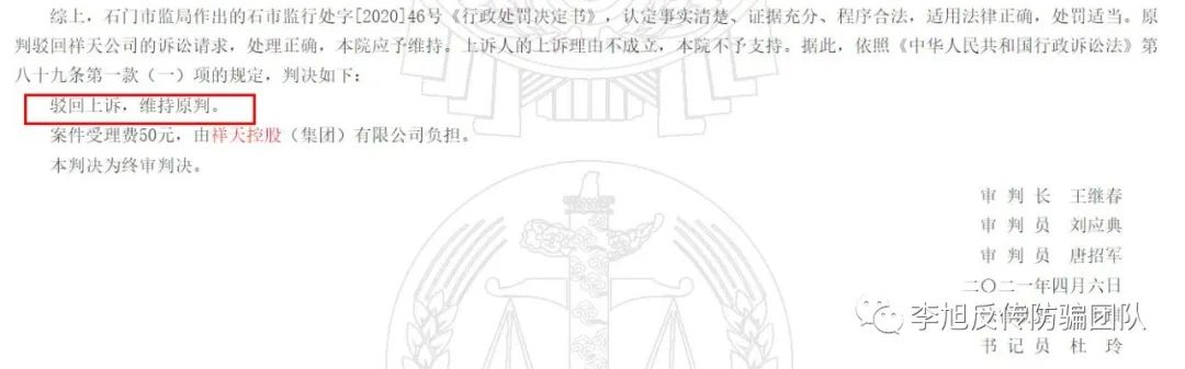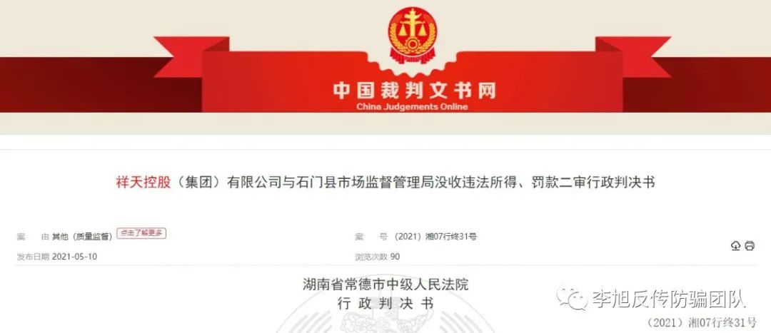 李旭反傳銷團(tuán)隊(duì)注意到,2021年5月10日,中國裁判文書網(wǎng)發(fā)布祥天控股(集團(tuán))有限公司與石門縣市場監(jiān)督管理局沒收違法所得、罰款二審行政裁決書。