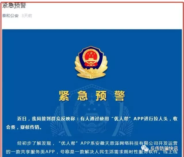 公安局緊急預(yù)警“優(yōu)人幫”APP涉嫌傳銷