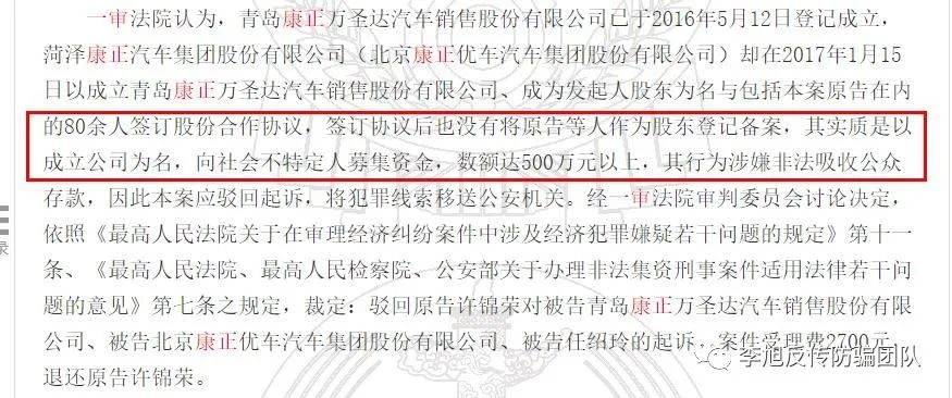 多則裁定書提到,青島康正萬圣達(dá)汽車銷售股份有限公司已于2016年5月12日登記成立,菏澤康正汽車集團(tuán)股份有限公司(北京康正優(yōu)車汽車集團(tuán)股份有限公司)卻在2017年2月17日以成立青島康正萬圣達(dá)汽車銷售股份有限公司、成為發(fā)起人股東為名與包括本案原告在內(nèi)的80余人簽訂股份合作協(xié)議,簽訂協(xié)議后也沒有將原告等人作為股東登記備案,其實質(zhì)是以成立公司為名,向社會不特定人募集資金,數(shù)額達(dá)500萬元以上,其行為涉嫌非法吸收公眾存款,因此本案應(yīng)駁回起訴,將犯罪線索移送公安機(jī)關(guān)。