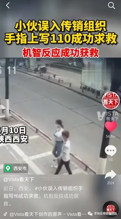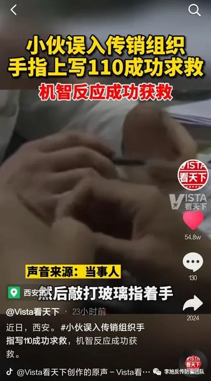 近日,陜西西安,小伙誤入傳銷組織手指寫110成功求救的新聞引發(fā)網(wǎng)友關(guān)注。四川男子小可(化名)到西安見網(wǎng)友,不料身陷傳銷組織,后來到銀行取錢時,他偷偷地在手指上寫下110,然后敲打柜臺的玻璃,成功吸引工作人員的注意,被工作人員報警救下。