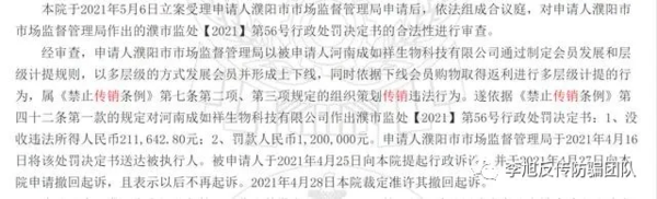 據(jù)《審查行政裁定書》顯示,經(jīng)審查,申請人濮陽市市場監(jiān)督管理局以被申請人河南成如祥生物科技有限公司通過制定會員發(fā)展和層級計提規(guī)則,以多層級的方式發(fā)展會員并形成上下線,同時依據(jù)下線會員購物取得返利進行多層級計提的行為,屬《禁止傳銷條例》第七條第二項、第三項規(guī)定的組織策劃傳銷違法行為。遂依據(jù)《禁止傳銷條例》第四十二條第一款的規(guī)定對河南成如祥生物科技有限公司作出濮市監(jiān)處【2021】第56號行政處罰決定書:1、沒收違法所得人民幣211,642.80元;2、罰款人民幣1,200,000元。申請人濮陽市市場監(jiān)督管理局于2021年4月16日將該處罰決定書送達被執(zhí)行人。被申請人于2021年4月25日向本院提起行政訴訟,并于2021年4月27日向本院申請撤回起訴,且表示以后不再起訴。2021年4月28日本院裁定準許其撤回起訴。