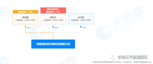 據(jù)天眼查APP顯示,河南成如祥生物科技有限公司成立于2017年12月19日,注冊資本為1500萬,翟家玉擔任法人、執(zhí)行董事兼總經(jīng)理,持股42%,張松建持股42%,趙云曉持股16%。此外,公開資料顯示,河南成如祥生物科技有限公司地處中原腹地鄭州,經(jīng)過多年的發(fā)展,現(xiàn)已成為一家集研發(fā)、銷售、運營為一體的綜合型企業(yè)。