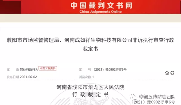 6月2日,中國裁判文書網(wǎng)公布一則題為《濮陽市市場監(jiān)督管理局、河南成如祥生物科技有限公司非訴執(zhí)行審查行政裁定書》(簡稱:《審查行政裁定書》)。