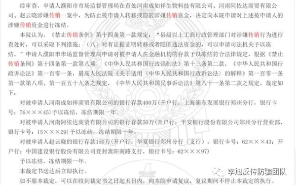 據(jù)《審查行政裁定書》顯示,經(jīng)審查,申請人濮陽市市場監(jiān)督管理局在查處河南成如祥生物科技有限公司、河南阿依達商貿(mào)有限公司、趙云曉涉嫌傳銷一案中,為防止被申請人轉(zhuǎn)移或隱匿涉嫌傳銷資金,決定向本院申請對上述被申請人的涉嫌傳銷資金進行凍結(jié)。