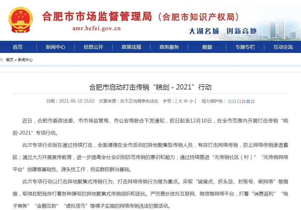 近日,合肥市委政法委、市市場監(jiān)管局、市公安局聯(lián)合下發(fā)通知,即日起至12月10日,在全市范圍內(nèi)開展打擊傳銷“皖劍-2021”專項行動。