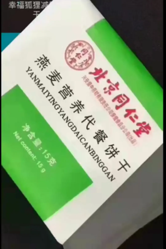 聲明中提到的侵權(quán)產(chǎn)品自然是幸福狐貍踏上轉(zhuǎn)型路上的第一步——燕麥營養(yǎng)代餐餅干。在代理的宣傳圖中,這款代餐餅干被大大方方的印上了北京同仁堂以及同仁堂的logo,任誰第一眼看都會(huì)覺得這是一款北京同仁堂出品的餅干,由百年老字號(hào)帶來的可信度和認(rèn)可度嗖嗖嗖的上升。