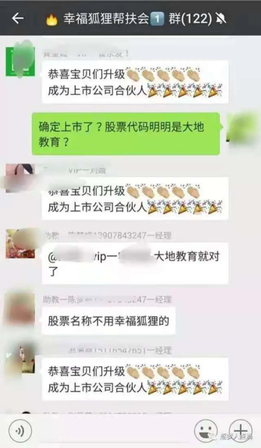 在代理們?yōu)槌蔀樯鲜泄竞匣锶似仗焱瑧c之時(shí),一位title為經(jīng)理的代理還在群內(nèi)回答稱,“大地教育就對(duì)了,股票名稱不用幸福狐貍的”。幸福狐貍哭暈在葡萄架下,是我站的不夠高嗎?不配擁有自己的姓名?