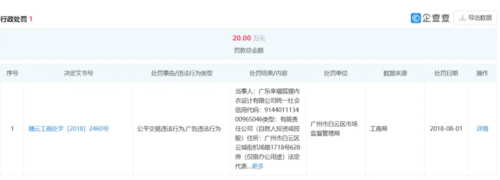 企查查信息顯示,2018年8月1日,幸福狐貍因公平交易違法行為、廣告違法行為被廣州市白云區(qū)工商行政管理局處以行政處罰20萬。