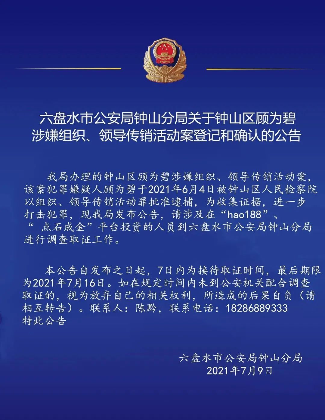 我局辦理的鐘山區(qū)顧為碧涉嫌組織、領導傳銷活動案,該案犯罪嫌疑人顧為碧于2021年6月4日被鐘山區(qū)人民檢察院以組織、領導傳銷活動罪批準逮捕,為收集證據(jù),進一步打擊犯罪,現(xiàn)我局發(fā)布公告,請涉及在“hao188”、“點石成金”平臺投資的人員到六盤水市公安局鐘山分局進行調查取證工作。