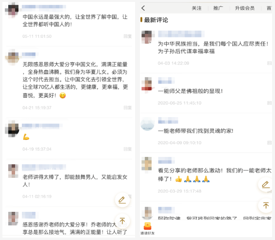 之后,就會試探性的推送帶有蠱惑性內(nèi)容的“圣德天下”課程片段,使用話術(shù)誘使客戶繳納少量費用,成為會員。再通過收聽所謂“點亮心燈”“宇宙真相”“宇宙之王”等線上課程,以弘揚佛、道教文化、中國傳統(tǒng)文化、正能量為幌子,進一步對會員進行誘導。