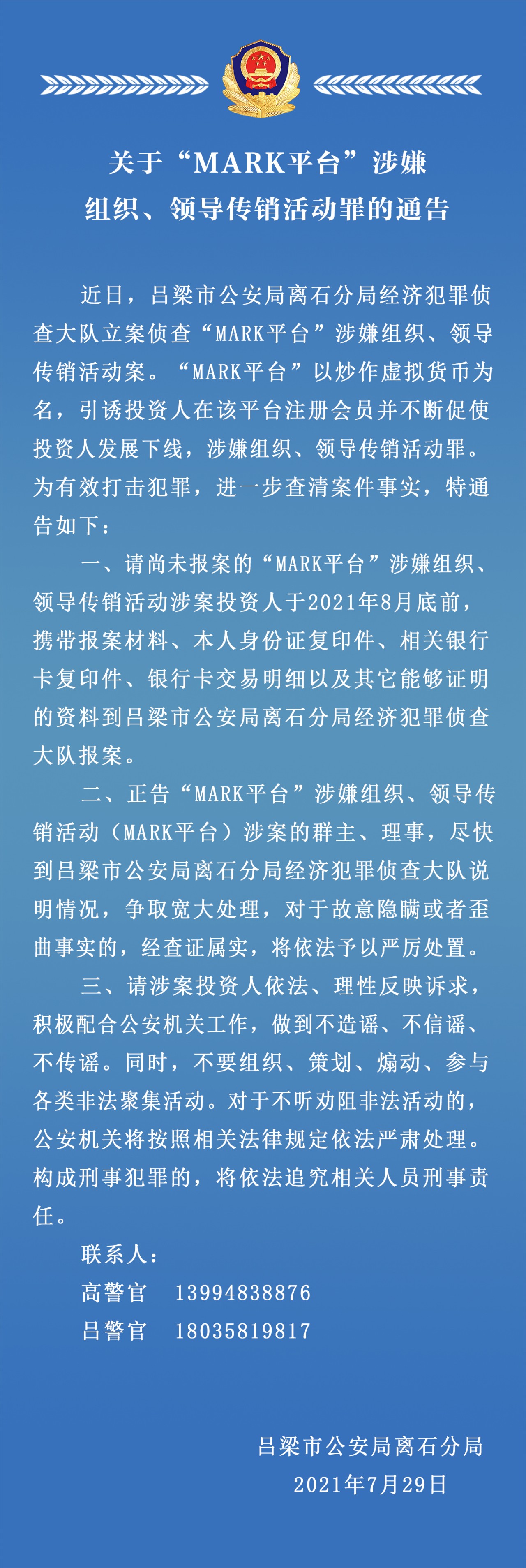 一、請(qǐng)尚未報(bào)案的“MARK平臺(tái)”涉嫌組織、領(lǐng)導(dǎo)傳銷活動(dòng)涉案投資人于2021年8月底前,攜帶報(bào)案材料、本人身份證復(fù)印件、相關(guān)銀行卡復(fù)印件、銀行卡交易明細(xì)以及其它能夠證明的材料到呂梁市公安局離石分局經(jīng)濟(jì)犯罪偵查大隊(duì)報(bào)案。