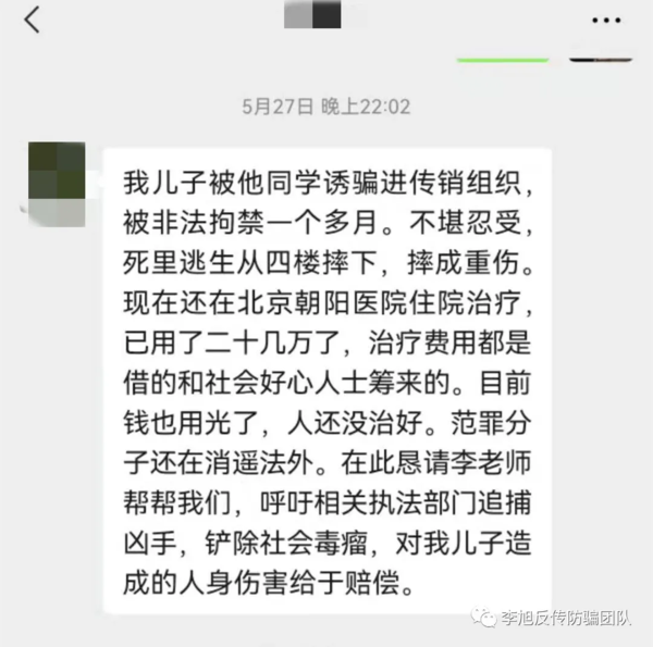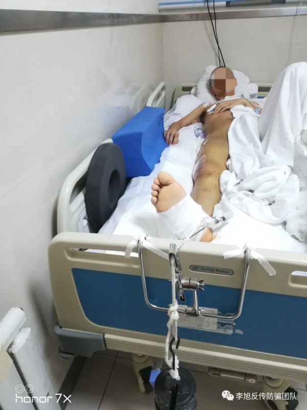 當(dāng)然隨著執(zhí)法部門(mén)不斷對(duì)這類(lèi)型傳銷(xiāo)的打擊,目前這種暴力的傳銷(xiāo)組織也越來(lái)越少了,但是并不是沒(méi)有。最近我們就接到一位父親的求助,他兒子被同學(xué)誘騙進(jìn)河北香河傳銷(xiāo)組織,被非法拘禁—個(gè)多月,不堪忍受,逃跑時(shí)從四樓摔下摔成重傷,現(xiàn)在還在醫(yī)院治療,真的很痛心。