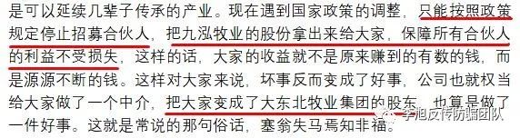 首先,因?yàn)椴皇侵苯雍炇鸬拇髺|北牧業(yè)集團(tuán)的股權(quán)協(xié)議。所以獲得的不是大東北牧業(yè)集團(tuán)的直接股份分紅。九泓牧業(yè)占股潤康牧業(yè)的40%,潤康牧業(yè)法定代表人才占股大東北牧業(yè)集團(tuán)的20%,就相當(dāng)于大東北牧業(yè)集團(tuán)股份分紅20%中的40%才是你們的收益,這就是“折上折”。不但如此,有網(wǎng)友跟李旭反傳銷團(tuán)隊(duì)反饋,他聯(lián)系過大東北牧業(yè)負(fù)責(zé)人,明確表示,大東北牧業(yè)及潤康都沒有融資需求。