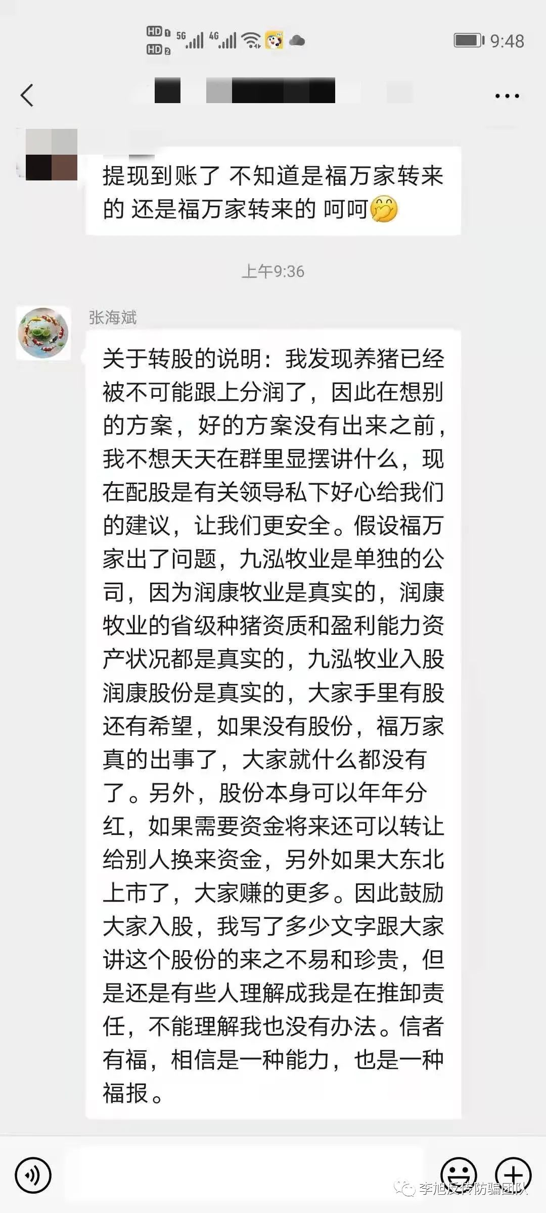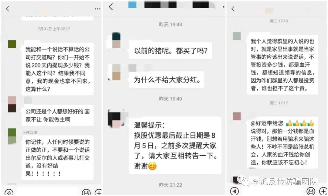 網(wǎng)友李四跟李旭反傳銷團(tuán)隊(duì)反饋,其父親被朋友忽悠投了幾萬塊錢,原本說好200天收回本金加收益92%,沒過多久突然說要400天才能返還本金,還宣傳股票,說投資的錢可以轉(zhuǎn)股。李四覺得不靠譜,勸說父親直接退錢,原本兩父子談的好好的,然而等父親跟上線一溝通,又被忽悠投資股權(quán)去了,說是以后年年可以分紅,還能分到下一代。