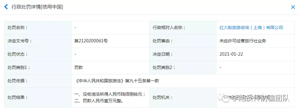 值得注意的是,該公司有一條自身風(fēng)險信息。是因未經(jīng)許可經(jīng)營旅行社業(yè)務(wù),被上海市閔行區(qū)文化和旅游局罰沒12000元。