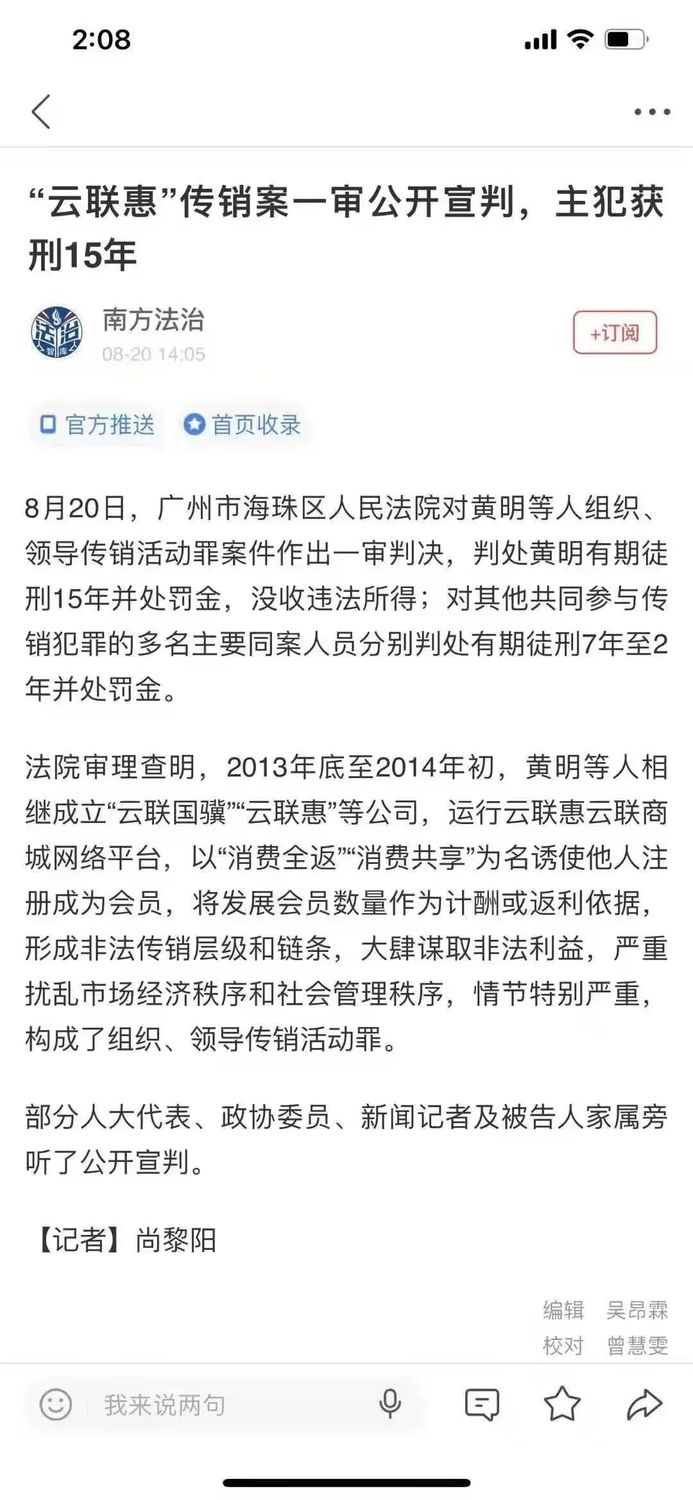 發(fā)表時(shí)間:2021-08-23 15:32來(lái)源:李旭反傳銷團(tuán)隊(duì)綜合南方法治、廣州公安 據(jù)南方法治報(bào)道,8月20日,廣州市海珠區(qū)人民法院對(duì)黃明等人組織、領(lǐng)導(dǎo)傳銷活動(dòng)罪案件作出一審判決,判處黃明有期徒刑15年并處罰金,沒(méi)收違法所得;對(duì)其他共同參與傳銷犯罪的多名主要同案人員分別判處有期徒刑7年至2年并處罰金。 ![]() 2018年5月8日,廣東省公安廳部署廣州警方開(kāi)展收網(wǎng)行動(dòng),成功摧毀“云聯(lián)惠”特大網(wǎng)絡(luò)傳銷犯罪團(tuán)伙,黃明等多名主要犯罪嫌疑人在行動(dòng)中落網(wǎng)。 2018年5月9日9時(shí),廣州市公安局發(fā)布了關(guān)于廣東云聯(lián)惠網(wǎng)絡(luò)科技有限公司(云聯(lián)商城)黃明等人涉嫌組織、領(lǐng)導(dǎo)傳銷犯罪通告。 至此之后,全國(guó)各地陸續(xù)對(duì)中高層骨干成員進(jìn)行抓捕、判刑,雖然各地都有判刑的,可云聯(lián)惠的部分參與者仍然堅(jiān)信公司是合法。 更有甚至,一些不法分子利用互聯(lián)網(wǎng)為載體,編造虛假信息,以“云聯(lián)惠回歸,本金全還、十倍積分回贈(zèng)”等為名,大量騙取他人錢財(cái);組織并指使人員在信息網(wǎng)絡(luò)上散布謠言,煽動(dòng)、組織、策劃部分會(huì)員非法聚集。 今年7月26日,廣州市公安局新聞辦公室通報(bào):廣州警方已陸續(xù)抓獲馬X磊等犯罪嫌疑人12名,并依法采取了刑事強(qiáng)制措施。 部分參與者癡迷的一個(gè)原因是主犯黃明遲遲沒(méi)有宣判,這讓部分參與者胡思亂想,今天(8月20日),時(shí)隔三年之久,“云聯(lián)惠”特大網(wǎng)絡(luò)傳銷案終于塵埃落定!!!黃明等多名主犯在廣州市海珠區(qū)人民法院受審,一審判處黃明有期徒刑15年并處罰金,沒(méi)收違法所得;對(duì)其他共同參與傳銷犯罪的多名主要同案人員分別判處有期徒刑7年至2年并處罰金。 希望那些參與者早日醒悟過(guò)來(lái),不要在包不切實(shí)際的幻想。 [此文來(lái)源:李旭反傳銷團(tuán)隊(duì)綜合南方法治、廣州公安,版權(quán)說(shuō)明:以上文字及圖片來(lái)源于網(wǎng)絡(luò),僅供學(xué)習(xí)和交流使用,不具有任何商業(yè)用途,其目的在于傳遞更多的信息,并不代表本平臺(tái)贊同其觀點(diǎn)。版權(quán)歸原作者所有,如涉版權(quán)或來(lái)源標(biāo)注有誤,請(qǐng)及時(shí)和我們?nèi)〉寐?lián)系,我們將迅速處理,謝謝!]