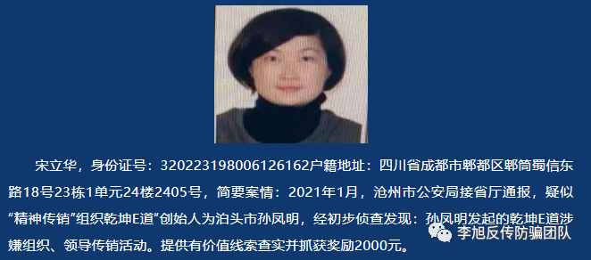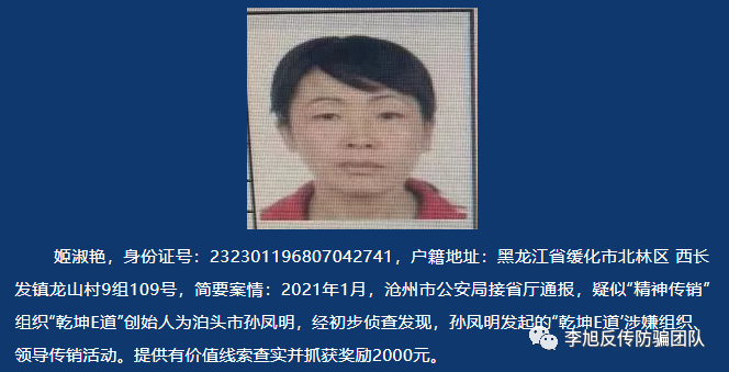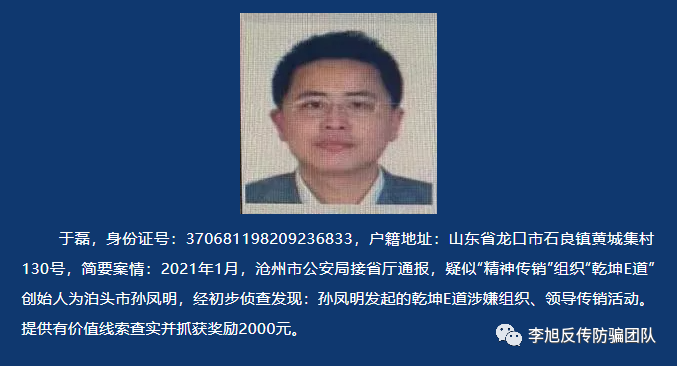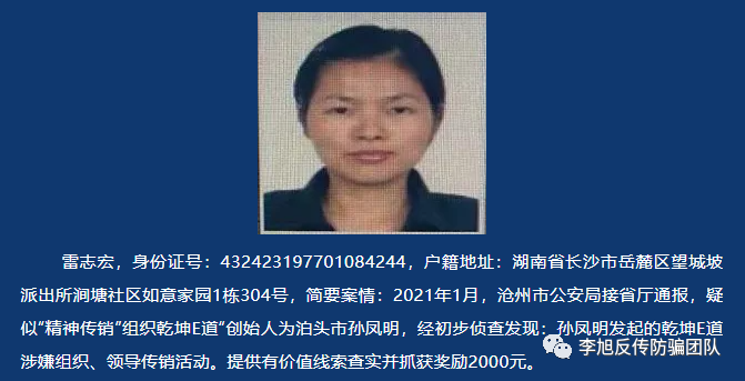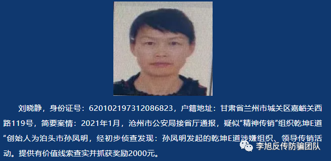 近日,李旭反傳銷團(tuán)隊(duì)了解到,“乾坤E道”被河北省滄州市泊頭公安定性“精神傳銷”,并對(duì)其團(tuán)伙中的7名在逃犯進(jìn)行公開懸賞通緝。