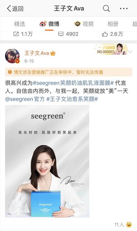 此外,今年 6 月 15 日,演員王子文還在個人微博官宣,稱其已成為 seegreen 品牌旗下 " 笑顏奶油肌乳液面膜 " 產(chǎn)品的代言人,更在出席品牌活動中利用其明星效應(yīng)為 seegreen 的品質(zhì)和效果背書。但中國網(wǎng)財經(jīng)記者卻發(fā)現(xiàn),截止發(fā)稿,王子文上述微博狀態(tài)卻顯示 " 博文涉及營銷推廣正在審核,暫時無法傳播 "。