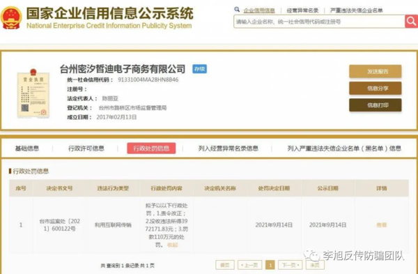 中國網(wǎng)財(cái)經(jīng) 9 月 27 日訊 ( 記者 高多多 ) 近日,國家企業(yè)信用信息公示信息系統(tǒng)顯示一則行政處罰信息,顯示臺州密汐皙迪電子商務(wù)有限公司因利用互聯(lián)網(wǎng)傳銷被臺州市市場監(jiān)督管理局罰沒 507.22 萬元。