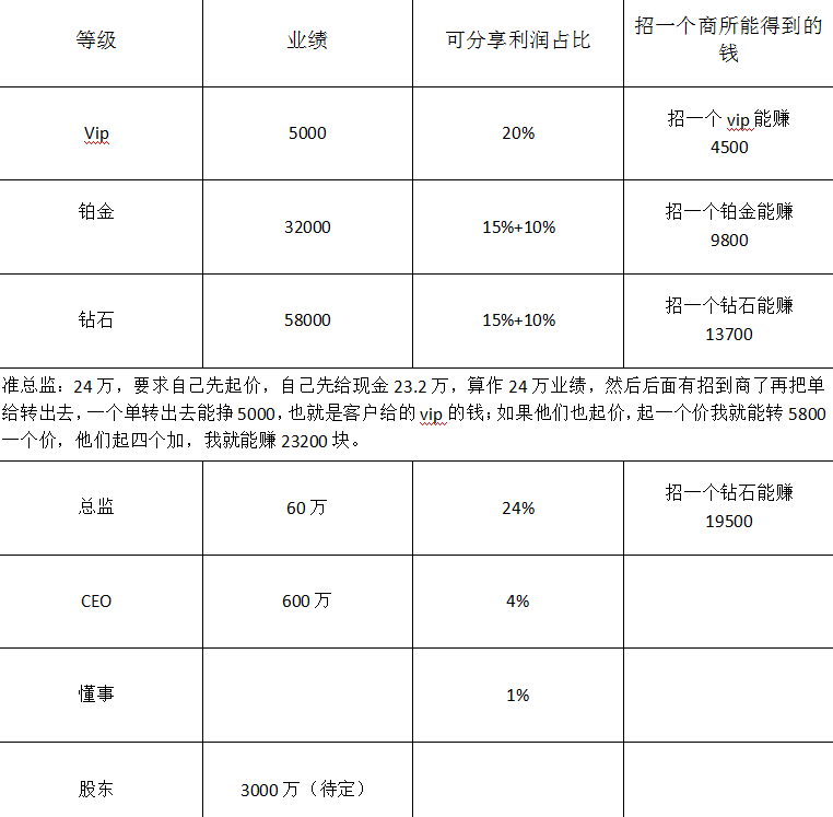 ▲深圳市博科生物科技有限公司升級(jí)、獎(jiǎng)勵(lì)制度 上到準(zhǔn)總監(jiān)之后,就是教你所謂額生意流程,怎么做ABC,A就是總監(jiān),分析者,B就是介紹人,起到橋梁的作用,C就是準(zhǔn)備被拉入傳銷的人。 反復(fù)強(qiáng)調(diào)這個(gè)是團(tuán)隊(duì)生意,你本身實(shí)力不夠的,無(wú)法吸引到別人過(guò)來(lái),A的出現(xiàn)能大大增加C更加信任這個(gè)生意,再加上團(tuán)隊(duì)里其他級(jí)別高的人出現(xiàn),就會(huì)顯得很有實(shí)力的樣子,而且很會(huì)對(duì)C非常關(guān)心,C就不由自主的會(huì)感動(dòng)、感謝,要加入這個(gè)所謂“溫暖”的大家庭,尤其是女生,孤僻的,自閉的人,非常容易淪陷,這就是他們所講的吸引力法則。 其實(shí)他們對(duì)每個(gè)準(zhǔn)備要加入的人都很好很關(guān)照,還吹噓只要你加入了公司,公司就是有74%收益返回,其實(shí)就是把每個(gè)聘級(jí)的返回利潤(rùn)加起來(lái)就有74%,而且很多vip、鉆石、準(zhǔn)總監(jiān)全都是自己拿錢砸上去的,還說(shuō)一定要上到總監(jiān)才會(huì)賺錢,總監(jiān)還有公司百分之二的股份,一年有兩次的分紅。 有新人加入質(zhì)疑這是在給別人下套的時(shí)候,她們就會(huì)統(tǒng)一口供說(shuō)這個(gè)是做生意的門道,是讓你們少走彎路,這個(gè)是在幫人,是給他們一個(gè)機(jī)會(huì),我們也是要挑人的好吧,陌生人熟人都可以做,熟人會(huì)更快點(diǎn)成單,信任度高,所以一定要多帶些親朋好友過(guò)來(lái)邀約,一直在強(qiáng)調(diào)這是在幫人不是拉人頭,是給他們一條發(fā)財(cái)之路。 一邊總是強(qiáng)調(diào)來(lái)這里剛開(kāi)始是為了錢,到最后是為了情,所以邀約朋友過(guò)來(lái)的時(shí)候不要一直想著那13700.一邊又有事沒(méi)事的給我們計(jì)算合作伙伴做生意的一個(gè)回報(bào)收益。一邊使勁的穿著多么漂亮華麗的衣服出入各種廣場(chǎng)喝咖啡,一邊吃飯又為了幾塊錢的茶位費(fèi)而跟服務(wù)員糾纏了半天。完完全全就沒(méi)有正經(jīng)談生意的痕跡,跟傳統(tǒng)生意不一樣,還吹噓說(shuō)這是最新輕資產(chǎn)創(chuàng)業(yè)。 后面在公司開(kāi)會(huì)打霧,越來(lái)越覺(jué)得惡心,聽(tīng)著他們報(bào)人名單,準(zhǔn)備約過(guò)來(lái)聯(lián)誼的人的情況的時(shí)候,原來(lái)我也曾上過(guò)他們的人名單,也分析過(guò)我的基本情況,家庭人員,工作崗位,經(jīng)濟(jì)情況,性格喜好等。我的情況上報(bào)給他的上線之后,已經(jīng)和上線溝通了怎么樣和我聊天,獲取信任度,了解我的想法,其實(shí)他一直用著ABC法則去跟我聊,天啊,這樣的人,還值得去信任嗎, 每周都會(huì)定期去酒店開(kāi)大會(huì),酒店還都是所有人AA每人15塊,幾個(gè)公司的人都會(huì)聚在一起,分享自己怎么約到客戶,怎么拉到一個(gè)人做了鉆石等等,之后就是聽(tīng)CEO級(jí)別的人去分享他們的一個(gè)經(jīng)歷,據(jù)說(shuō)做到CEO級(jí)別的都是買了好幾套房,其實(shí)也是拿著你們準(zhǔn)總監(jiān)鉆石所有人得錢買的。 總說(shuō)這個(gè)生意是你自己的,你自己賺的錢,自己安排自己的時(shí)間,但是每天做些什么去了哪里都是和上線匯報(bào),還說(shuō)做這個(gè)生意一定要“聽(tīng)話、照做、歸零”,只有這樣才能賺到錢,如果你是按照你自己的想法去做,你肯定賺不到錢。 7月-9月這段時(shí)間是謝某hang要上位CEO,要團(tuán)隊(duì)里的每個(gè)人都要加油,每個(gè)人都要做業(yè)績(jī),有人約過(guò)來(lái)的就趕緊約過(guò)來(lái)聯(lián)誼,實(shí)在沒(méi)有得就暗示底下的人自己做單撐業(yè)績(jī)上去,實(shí)際上每個(gè)人都負(fù)債好幾十萬(wàn),但他們都不會(huì)對(duì)新人說(shuō),依舊會(huì)包裝自己吹噓每個(gè)月賺幾萬(wàn)幾萬(wàn),其實(shí)只有一個(gè)月賺幾萬(wàn)塊錢,而且還是自己拿錢填業(yè)績(jī)拿回來(lái)的回扣,無(wú)語(yǔ)了。。。還說(shuō)以后會(huì)把自己下面的單轉(zhuǎn)出去,一定會(huì)回本的,其實(shí)就是把自己朋友親戚拉過(guò)來(lái)讓他們做鉆石,把自己欠的錢讓自己朋友家人來(lái)填補(bǔ),轉(zhuǎn)移給他們,真是好手段。 一開(kāi)始還吹噓什么可以21天之內(nèi)可以退款,那時(shí)候找那個(gè)所謂的嘉哥要退貨,直接放狠話的罵我,超級(jí)兇,氣勢(shì)上蓋過(guò)去,還說(shuō)什么你的貴人對(duì)你那么好你就讓他那么失望? 一個(gè)勁的只要你做下去,還說(shuō)這個(gè)行業(yè)不淘汰任何人,都是自己淘汰自己,等過(guò)了21天又會(huì)說(shuō)這個(gè)只是你和公司的合同,沒(méi)有經(jīng)過(guò)我的手,我也沒(méi)有簽字,你要退就找公司。