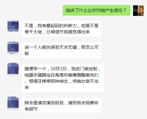 就這樣一直到10月13日,重頭戲來到了,中午12點(diǎn)多吃完午飯(半碗米飯+清水炒茄子),李四被拉到了頭目的臥室,被迫聊天一直聊到晚上十點(diǎn)半。