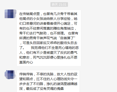 內(nèi)容大致是“你考察這么久看懂了啥,想清楚了啥,這項(xiàng)目你覺得怎么樣,做不做這項(xiàng)目等等”。李四表示自己想回家做回原的工作,然而傳銷頭目的語氣就轉(zhuǎn)換成了“為啥不想留下來,哪里讓你覺得不好了”,李四每說一句理由,傳銷頭目都一大堆道理駁回,最后讓李四感覺是他自己思想有問題。