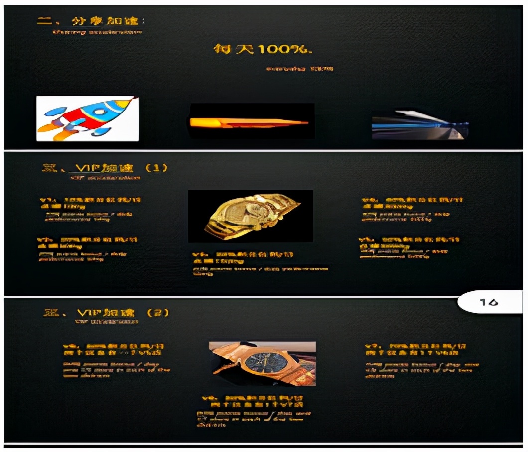 “鑫愛億生珠寶”推出購買黃金價格為600元/克,投資人每購買1克黃金給予價值等同1.5個積分進(jìn)行返利,10克黃金起購,每天按照3‰進(jìn)行釋放。也可當(dāng)天變現(xiàn),在現(xiàn)場,有所謂的“第三方”在報單現(xiàn)場收黃金并可進(jìn)行墊資,購買100克黃金只需要23500元。分享加速共分為10個等級,V1:10%積分/日,業(yè)績要求:100g;V2:20%積分/日,業(yè)績要求:500g;V3:30%積分/日,業(yè)績要求:1500g;V4:40%積分/日,業(yè)績要求:3000g;V5:50%積分/日,業(yè)績要求:5000g;V6:60%積分/日,兩個區(qū)各有一個V5;V7:70%積分/日,兩個區(qū)各有一個V6;V8:80%積分/日,兩個區(qū)各有1個V7,V9:90%積分/日,三個區(qū)各有一個V8;V10:100%積分/日,三個區(qū)各有1個V9;平級加速:10%積分/日(一代)。輔導(dǎo)津貼共分五個: 1、工作室:1)申請條件:一次性購買100g,團(tuán)隊(duì)業(yè)績累計(jì)達(dá)到500g。(合計(jì)600克)2)津貼:新增業(yè)績10元/g;2、服務(wù)中心:1)條件:直推三個工作室,有50平米專屬場地。(合計(jì)1800克以上)2)津貼:新增業(yè)績15元/g ;3、區(qū)代理:1)申請條件:直推3個服務(wù)中心,有100平米場地。(合計(jì)5400克以上)2)津貼:新增業(yè)績20元/g;4、市代理:1)申請條件:直推三個區(qū)代理,有150平米場地。(合計(jì)16200克)2)津貼:新增業(yè)績25元/g;5、運(yùn)營中心1)申請條件:直推三個市代理,有200平米場地。(合計(jì)48600克)2)津4貼:新增業(yè)績30元/g。