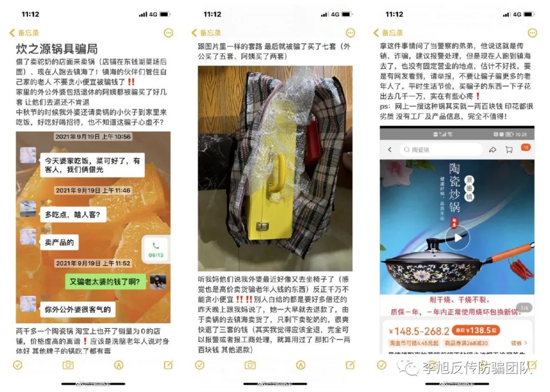 有網(wǎng)友早在2020年末在李旭反傳銷團(tuán)隊(duì)論壇上留言稱,“江西京尚炊之源站街邊發(fā)小廣告,專門發(fā)給老人,以免費(fèi)拿禮物吸引一大波老年人,第一天到場(chǎng)發(fā)雞蛋,看大伙不上鉤第二天再發(fā)瓷勺子瓷鏟,還限時(shí)限量搞饑餓營(yíng)銷,故意在淘寶上僅用1000元設(shè)一個(gè)店鋪,2019年七月至今僅顯示賣出六件東西,而且沒(méi)有任何一個(gè)評(píng)論,一個(gè)套餐鍋在3000元以上,還有所謂鍍金19999元一個(gè),然后拍個(gè)視頻告訴老人網(wǎng)上都賣5000+,現(xiàn)場(chǎng)給老人洗腦稱你們家的廚房到處都是有毒餐具,那些蘇泊爾等從北京開(kāi)始都淘汰了,老人個(gè)個(gè)拿了不值錢小禮品,或幾個(gè)雞蛋,幾個(gè)小瓷勺,小瓷鏟等就心甘情愿被洗腦,對(duì)業(yè)務(wù)員的說(shuō)辭深信不疑,從而一天天地步入高價(jià)買鍋的誘騙老人陷阱?!?/p>
