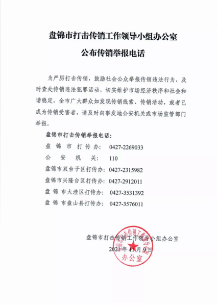 盤(pán)錦市打擊傳銷(xiāo)工作領(lǐng)導(dǎo)小組辦公室公布傳銷(xiāo)舉報(bào)電話