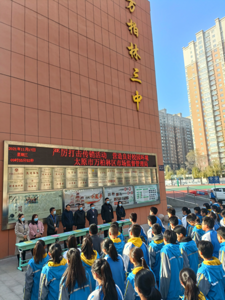 區(qū)市場局黨工委委員楊俊文,萬柏林第三中學(xué)呂校長、張校長,區(qū)局執(zhí)法稽查股全體工作人員參加了此次宣傳活動。太原市場局雙反科李志剛科長對此次活動進(jìn)行現(xiàn)場指導(dǎo)。