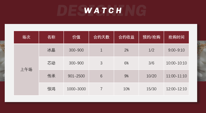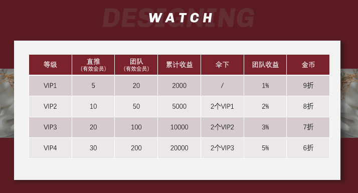 預(yù)約搶購,每個類型的羅威妮都有固定的搶購時間,可以進(jìn)行提前預(yù)約,預(yù)約后進(jìn)行搶購可以節(jié)省一半的金幣,匹配成功后支付,否則視為放棄,搶購成功后,在合約期間不能交易,每天可以獲得固定的收益。每次搶購手表需要花費(fèi)一定的金幣。 該項(xiàng)目總共有5個級別,購買手表即是會員,會員升級為VIP1需要直接推薦5名會員,團(tuán)隊(duì)有20名會員;VIP1升級為VIP2需要直接推薦10名會員,團(tuán)隊(duì)有50名會員,要求有2名VIP1;VIP2升級為VIP3需要直接推薦20名會員,團(tuán)隊(duì)有100名會員,要求有2名VIP2;VIP3升級VIP4需要直接推薦30名會員,團(tuán)隊(duì)有200名會員,要求有2名VIP3,級別越高,從上線購買的金幣越便宜。 該項(xiàng)目收益分為動態(tài)收益、靜態(tài)收益還有團(tuán)隊(duì)收益,靜態(tài)收益即購買手表后,每天的收益,投資金額從300元到18000元不等,收益最低是2%,最高可達(dá)27%。