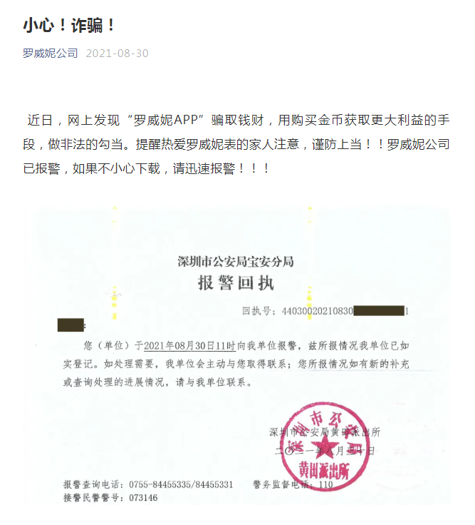 損失慘重的會員在群里吵吵嚷嚷,而高層在安撫的同時,還在介紹說會對接新項(xiàng)目,帶領(lǐng)會員不僅把投進(jìn)去的錢拿回來,還能讓會員賺到大錢過個好年并能實(shí)現(xiàn)財(cái)富夢想夢想成真! 承諾雖好,但結(jié)果卻差強(qiáng)人意! 大概10月17日左右平臺重新啟動,該項(xiàng)目重新嫁接到了“墨鑫書苑”項(xiàng)目,老會員的資產(chǎn)都嫁接過去了??善脚_沒有維持幾天就關(guān)停,群主把群解散,至此再無下文。 據(jù)張先生介紹,該項(xiàng)目的參與者主要來自三個地方:淄博周村、濟(jì)南章丘、還有山東鄒平,有四百多人的會員群,還有好幾個一百多人會員群。 李旭反傳銷團(tuán)隊(duì)搜索發(fā)現(xiàn),在今年8月底,深圳市羅威妮表業(yè)有限公司官方平臺發(fā)表一則《小心!詐騙!》的文章,明確寫明“羅威妮APP”系詐騙,公司已經(jīng)報(bào)警。