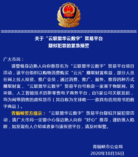 此前寧夏青銅峽市公安局官方微信發(fā)布一則《【預(yù)警信息】關(guān)于“云聯(lián)盟華云數(shù)字”貿(mào)易平臺疑似犯罪的緊急預(yù)警》文章,內(nèi)容如下:
