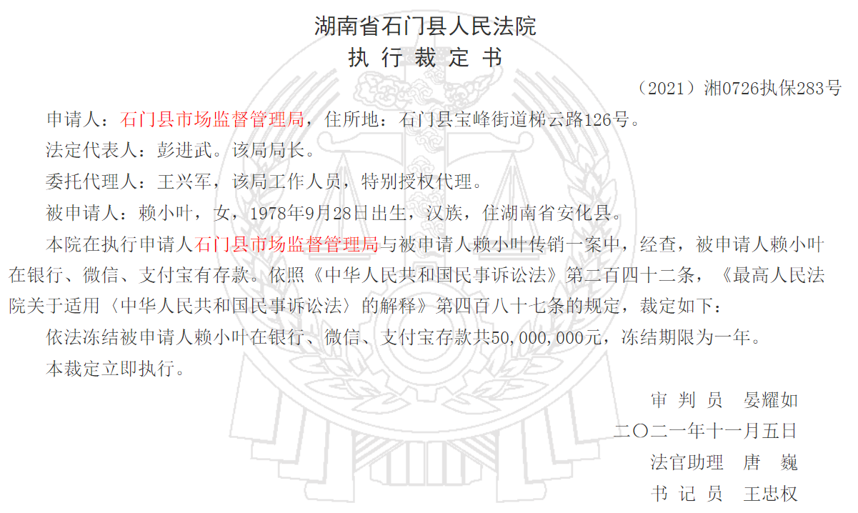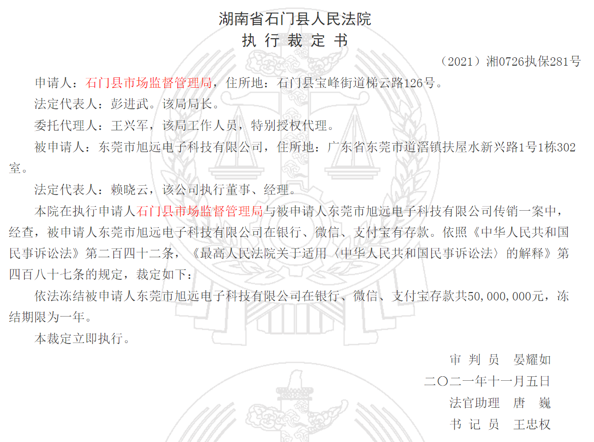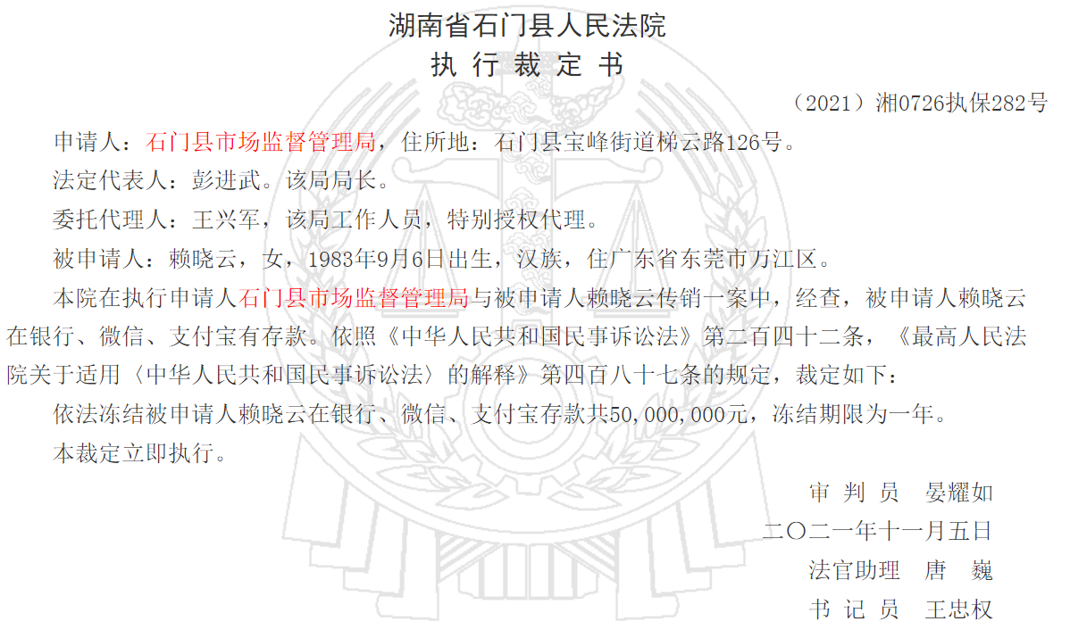近日,李旭反傳銷團(tuán)隊(duì)獲悉,湖南省石門縣人民法院發(fā)布三則財(cái)產(chǎn)保全執(zhí)行裁定書(以下簡(jiǎn)稱裁定書),三份裁定顯示,賴曉云、賴小葉、東莞市旭遠(yuǎn)電子科技有限公司三方因傳銷被石門縣市場(chǎng)監(jiān)督管理局申請(qǐng)凍結(jié)累計(jì)達(dá)1.5億元。