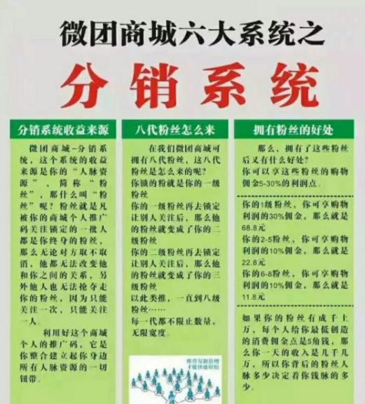 據(jù)了解,微團(tuán)商城的創(chuàng)立,正好趕上微商爆發(fā)初期,發(fā)展非常迅速。微團(tuán)商城最早宣傳有六大系統(tǒng),其中最有爭(zhēng)議的是其中8級(jí)分銷系統(tǒng)。