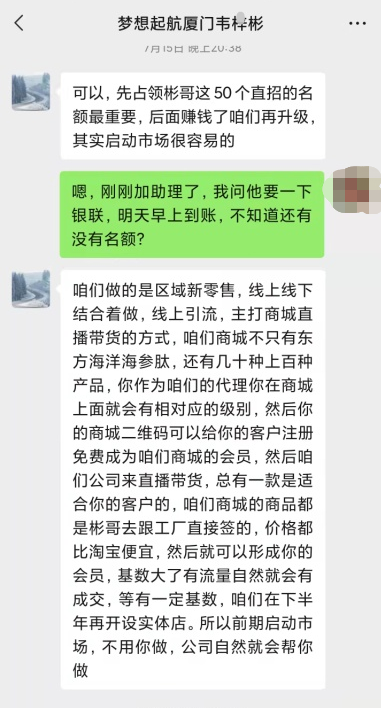 張女士在沒有做“東方海洋海參膠原肽”的代理商之前,韋某彬團(tuán)伙聲稱會(huì)一對(duì)一指導(dǎo),教你如何全國(guó)尋找合伙人,每晚商學(xué)院進(jìn)行線上培訓(xùn),商學(xué)院每天培訓(xùn)如何通過手機(jī)將產(chǎn)品推廣向全國(guó)等等,可張女士投資做代理后,這些所謂的培訓(xùn)壓根就沒有進(jìn)行,而且韋某彬與張女士的聯(lián)系也越來越少;