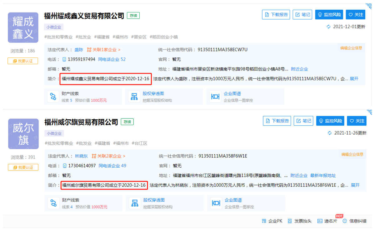產(chǎn)品到家后,發(fā)現(xiàn)生產(chǎn)廠家山東東方海洋科技股份有限公司,委托方卻是福州威爾旗貿(mào)易有限公司。小編通過企查查了了解到這兩家公司是居然同一天注冊(cè)。
