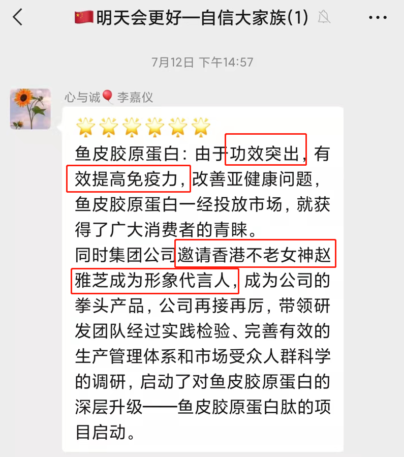 韋某彬團(tuán)伙宣傳的產(chǎn)品是“東方海洋海參膠原肽”,該產(chǎn)品是一塊食品飲料,而在群中宣傳的卻有藥品的效果;