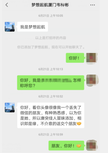 事情的這樣的,張女士是在一家公司上班,因工作原因經(jīng)常有陌生好友添加微信,有一天,一位自稱韋某彬的人添加她好友,韋某彬聲稱:看你頭像很像我一個(gè)丟失了微信的朋友,有種熟悉感,以為你是她,唐突佳人冒昧添加,相識(shí)即是緣,不介意的話交個(gè)朋友。