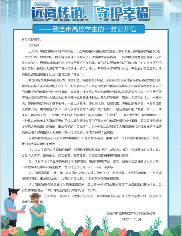 本次宣傳教育活動共發(fā)放宣傳頁等宣傳品3000余份,并向廣大高校同學(xué)發(fā)出“遠(yuǎn)離傳銷、守護(hù)幸?!钡囊环夤_信。