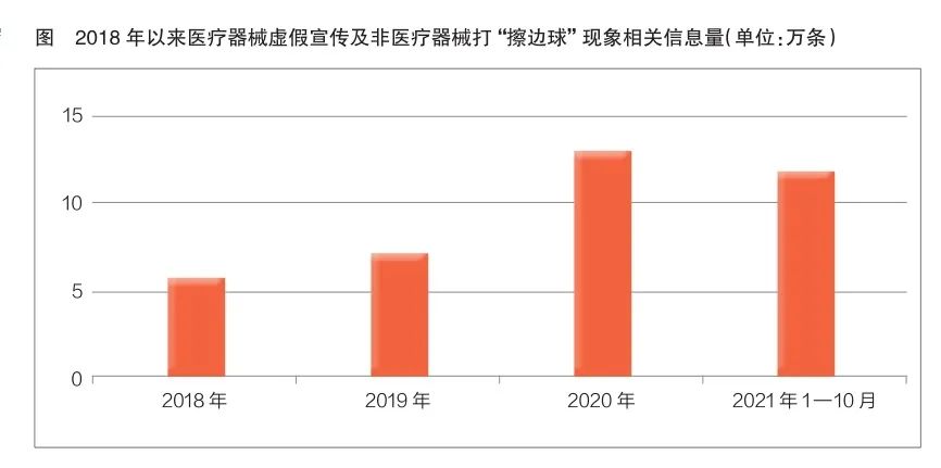 2018年—2020年,醫(yī)療器械虛假宣傳相關(guān)信息量逐年遞增。今年截至10月27日,相關(guān)信息量約12萬條,預(yù)計今年相關(guān)信息量與2020年持平,較2018年、2019年有較大幅度增長(見圖)。