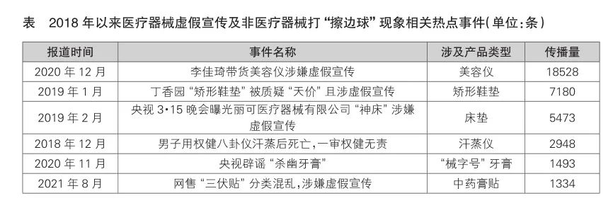 從熱點事件來看,2020年12月,李佳琦帶貨美容儀涉嫌虛假宣傳是2018年以來傳播量最多的事件,傳播量達18528條;第二為2019年1月的丁香園“矯形鞋墊”被質(zhì)疑“天價”且涉虛假宣傳事件,傳播量為7180條;第三為2019年央視“3·15”晚會曝光的麗可醫(yī)療器械有限公司“神床”涉嫌虛假宣傳事件,傳播量為5473條(見表)。