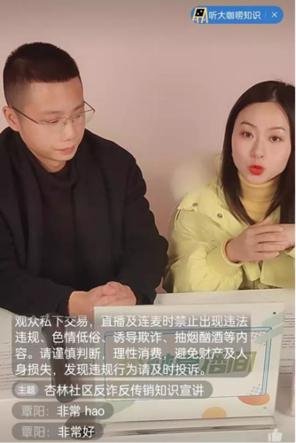 2021年12月4日—5日,由成都市婦女聯(lián)合會主辦,溫江區(qū)婦女聯(lián)合會、成都市溫江區(qū)人民政府永寧街道辦事處、溫江區(qū)永寧街道杏林社區(qū)居民委員會協(xié)辦,好彩同創(chuàng)社會工作服務(wù)中心承辦的杏林社區(qū)“家政進(jìn)社區(qū)”幸福美好生活·新市民微課堂第四期“禁傳銷,反欺詐”反詐反傳銷知識宣講活動在杏林社區(qū)開展,200余人參與了本次活動。本次宣講由反詐反傳銷知識進(jìn)小區(qū)活動與直播問答兩部分組成。