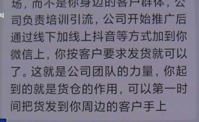 李女士:他說(shuō)他要在各大車(chē)站,飛機(jī)場(chǎng),各大平臺(tái)抖音、快手上打廣告引流,你們只是起一個(gè)貨倉(cāng)的作用,不需要去忙著推銷(xiāo),你囤貨在那里,有人就會(huì)主動(dòng)來(lái)找你發(fā)貨,群里面就有很多的轉(zhuǎn)賬截屏。
