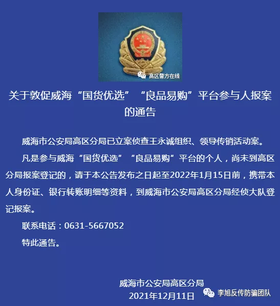 凡是參與威?!皣泝?yōu)選”“良品易購”平臺(tái)的個(gè)人,尚未到高區(qū)分局報(bào)案登記的,請于本公告發(fā)布之日起至2022年1月15日前,攜帶本人身份證、銀行轉(zhuǎn)賬明細(xì)等資料,到威海市公安局高區(qū)分局經(jīng)偵大隊(duì)登記報(bào)案。