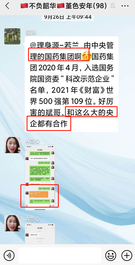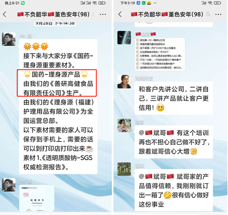 進群后發(fā)現(xiàn),群里的人在互動,發(fā)正能量語言,還有些人將話題引導至劉堂斌事業(yè)方面——斌哥做事業(yè)這么好,帶我們一起掙錢,進而滲透到“國藥集團”理身源口服玻尿酸的事,群里不斷有人不停配合,這個群每天都有互動。